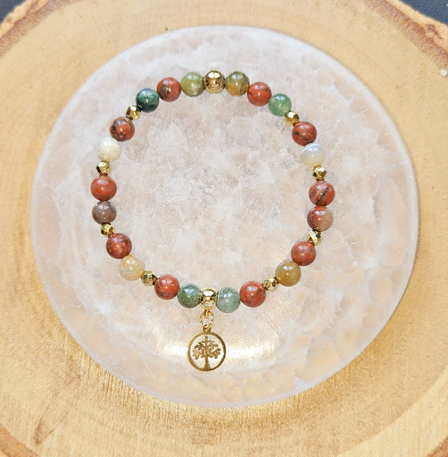 Un bracelet pour renforcer l’élan de vie et la détermination. Le Jaspe Rouge stimule l’ancrage, la vitalité et le courage d’agir, l’Agate Indienne apporte stabilité, énergie équilibrée et clarté émotionnelle, et l’Arbre de Vie symbolise la force enracinée, la croissance et la connexion sacrée. Un bijou pour avancer avec courage, puissance et stabilité.