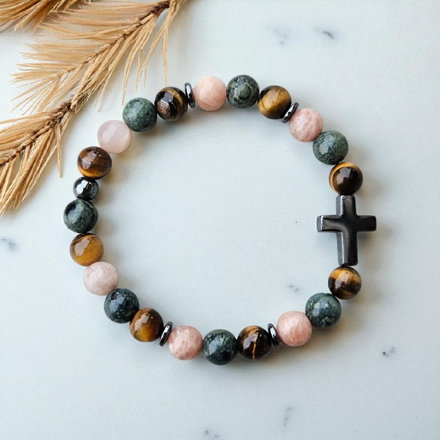 Un bracelet qui protège, élève et illumine. Le Jaspe Kambaba apaise et stabilise, l’Œil de Tigre protège et renforce la confiance, la Pierre de Soleil booste le rayonnement et la joie, et la Croix Chrétienne symbolise la foi et la lumière intérieure. Un allié sacré pour avancer avec force, confiance et protection.