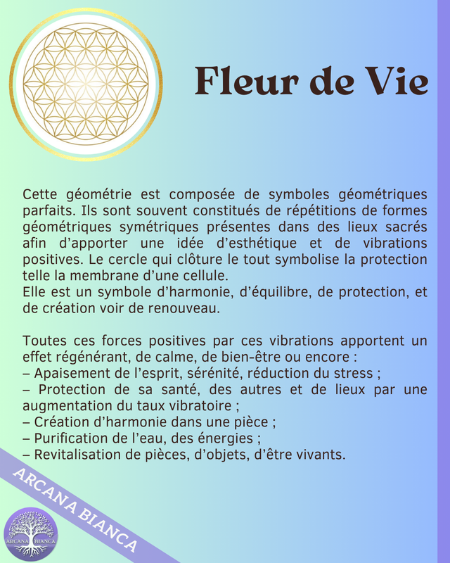 Les vibrations émises par la géométrie sacrée de la fleur de vie auraient des vertus d'harmonie, d'équilibre et de recharge. Elle représente un outil précieux pour recharger l'eau (pas de contact direct) et les minéraux...