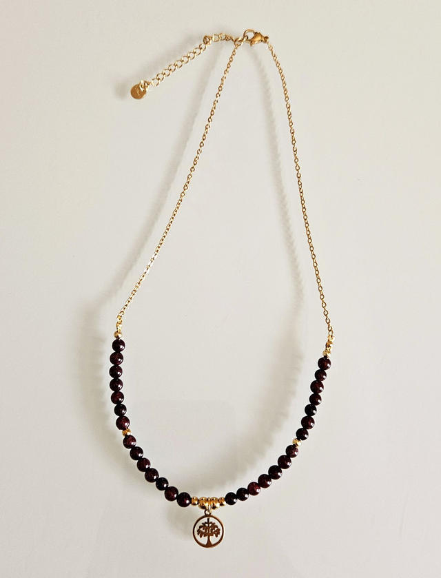 Un ras-de-cou pour renforcer la vitalité, la volonté et la connexion à ses racines profondes. Le Grenat stimule l’énergie, la passion, la persévérance et la force de vie, l’Arbre de Vie symbolise l’ancrage, la sagesse, la croissance et l’équilibre entre ciel et terre. Ensemble, ils soutiennent une énergie stable, puissante et en expansion. Un bijou pour les femmes qui avancent avec confiance, enracinement et conscience de leur puissance intérieure.