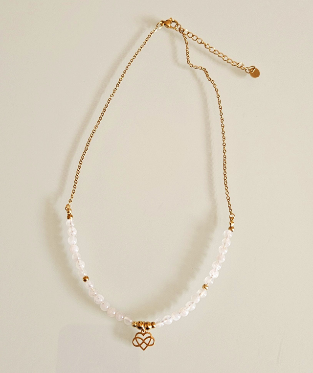 Un ras-de-cou pour honorer l’amour sincère, l’intuition et les émotions douces. La Pierre de Lune favorise la connexion aux cycles intérieurs, à la tendresse et à la sagesse féminine, le Cœur Infini symbolise un amour éternel, fluide et inconditionnel. Ensemble, ils résonnent avec l’ouverture du cœur et la réconciliation émotionnelle. Un bijou pour les femmes qui vivent dans l’amour, la douceur et la pleine conscience de leur lumière intérieure.