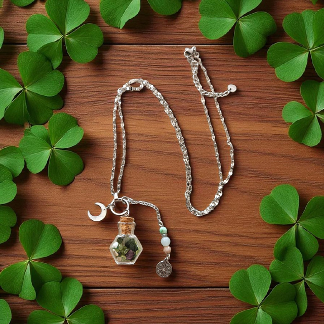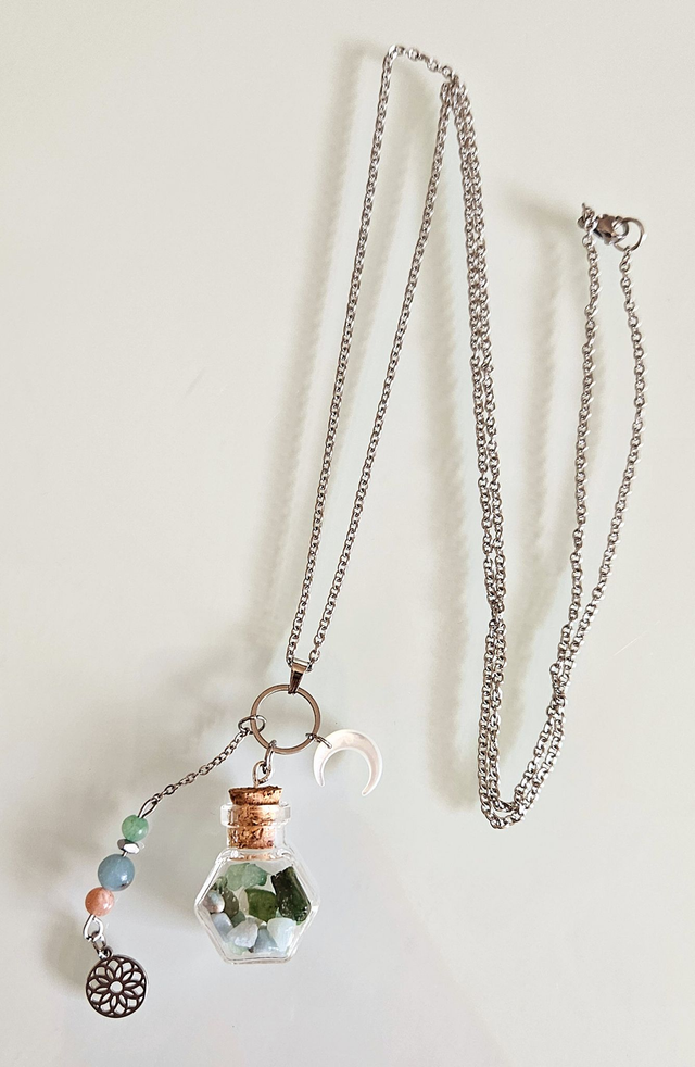 Collier en pierres naturelles de 3/4mm, accompagné de breloques, mini Spelljar en verre et chaîne en acier inoxydable.