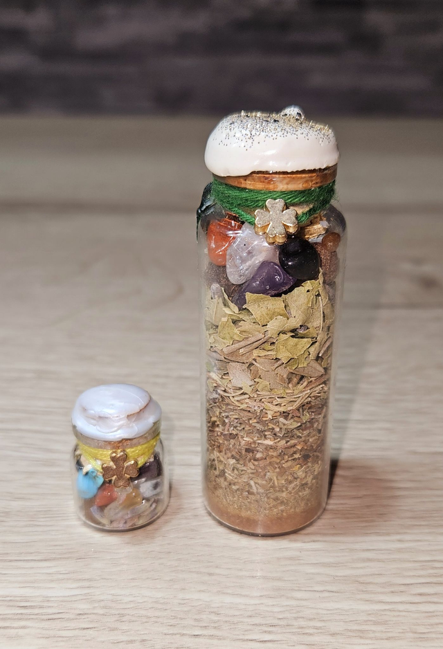 Chaque spelljar est un élixir d’intention, soigneusement composé à la main à partir d’éléments naturels, de pierres, d’herbes et de symboles vibratoires. Les couleurs du lien, la breloque accrochée, et même les composants peuvent varier, mais l’énergie du thème reste toujours la même. Ces fioles magiques accompagnent vos rituels, vos méditations ou simplement votre quotidien, comme des gardiennes d’énergie à garder près de soi, dans un espace sacré, au travail, dans la voiture... Chaque pièce est unique. Parce que chaque intention l’est aussi.